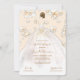 Gorgeous hand drawn watercolor bride with brown hair and dark skin in her wedding dress and surrounded by magnolias and glitter. Back of invitation features wedding rings in box with bride and groom's initials.