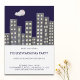 Watercolor housewarming party invitation with an illustration a night sky apartment buildings city. Personalise the text with your own. Illustrated and designed by Patricia Alvarez.