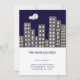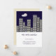 Watercolor moving announcement with an illustration a night sky apartment buildings city. Personalise the text with your own. Illustrated and designed by Patricia Alvarez.