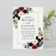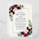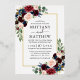 Modern Elegant Watercolor Burgundy Blue Floral Wedding Invitation includes burgundy roses, pink roses, blue flowers, red flowers, eucalyptus leaves and botanical greenery. Gold Foil Frame.