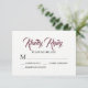 A beautiful RSVP response card that begins Kindly Reply. The front of the card is very simple and modern. Kindly Reply is written in a large modern flowing burgundy red script. The reply date and accepts and declines are below. The back of the response card is a beautiful burgundy floral with navy blue and pink accents. This RSVP card is party of the Burgundy Watercolor Floral Collection. You should be able to see the coordinating items on this page. If you don't, please contact me for a link.