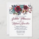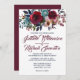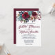 Rich burgundy red marsala floral design is perfect for a fall or winter wedding. In addition to the deep burgundy flowers, there are smaller light pink and soft blue watercolor flowers. There are a variety of leaves that give the floral design a light and airy quality. The wedding couple names are written in a gorgeous formal script in burgundy. The remainder of the text is an elegant black font. The back of the wedding invitation is deep burgundy with a large coordinating floral bouquet. This modern floral wedding invitation is part of a wedding stationery suite that should be visible on this page. If you don't see it, please contact me for the link.
