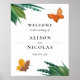 This elegant Wedding Sign Poster features two beautiful butterflies (bridal and groom) flying around green foliage illustrated in watercolor. The ideal choice for spring and summer weddings. Personalize your information at the center of the poster in a mix of traditional block and modern calligraphy fonts.