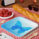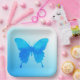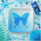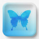 A single, large, watercolor butterfly in shades of cobalt, turquoise and sky blue on a pastel gradient background paper plate