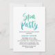 This watercolor calligraphy spa party invitation card is perfect for a summer baby shower. The fun and energetic design features a pretty teal green and aqua blue ombre watercolor script font.