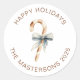 Round sticker featuring a cute watercolor candy cane illustration encircled with a holiday greeting and your own personalised name and year.