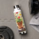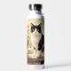 An illustration of a black and white cat sitting on a flower filled window sill. A beautiful water bottle to up your drinking game.