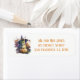 Halloween design with a cute illustration featuring a watercolor cat with a magic hat and a pumpkin.