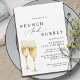 Elegant and modern birthday brunch invitations featuring a watercolor illustration of champagne glasses. Simple black font on a white background, with a pale pink pattern on the back.