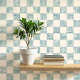 Geometric chequered design with sea foam green and cream textured watercolor squares. Calm and neutral for a feeling of light and space.