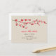 A simple modern wedding save the date postcard featuring a watercolor inspired illustration of a branch of pink cherry blossoms over a background of deep off white. Customisable red and brown text. Look for matching wedding invitations, rsvp cards, postage, and address labels at Jill's Paperie.
