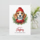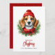 Sweet watercolor style illustration of an adorable Beagle dog wearing a red scarf and hat on a background of christmas greenery.