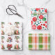 Three sheets of Christmas wrapping paper, First one has cute stockings', candles and Poinsettias. The second has green and red watercolor festive holiday polka dots. The third is a chequered tartan plaid in red and green.