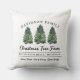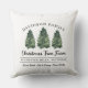 A rustic watercolor Christmas tree farm throw pillow featuring three beautiful hand-painted evergreen trees with a customizable family name, city, and state. The vintage sign-inspired layout with "Farm Fresh, Cut & Carry, Open Daily" script captures the charm of a country Christmas tree lot. Personalize all text fields to create a one-of-a-kind holiday keepsake or meaningful Christmas gift.