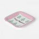 This adorable Christmas square paper plate features an assortment of whimsical, pastel Christmas trees on pink plaid background and says "Merry Christmas" (or personalise to a name or different phrase).