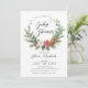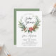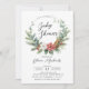 This elegant Christmas baby shower invitation features a delicate watercolor wreath of pine, poinsettia flowers, and pine cones. The invitation is perfect for celebrating the mum to be during the holiday season. The front of the invitation features the wreath and the mum's name, date, time, and location of the shower. The overall design is festive and sophisticated, and the invitation is sure to impress your guests.