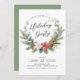 This elegant Christmas holiday party invitation features a delicate watercolor wreath of pine, poinsettia flowers, and pine cones. The invitation is perfect for inviting your friends and family to a festive holiday gathering. The front of the invitation features the wreath and the date, time, and location of the party. The overall design is festive and sophisticated, and the invitation is sure to impress your guests.