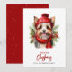 Sweet watercolor style illustration of an adorable Yorkshire Terrier dog wearing a red scarf and hat on a background of christmas greenery.
