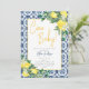 This fun baby shower invitation has a Italian blue tile theme with citrus accents. The Title says "Ciao, Baby! in a yellow modern script. At the corners, there are elegant orange, floral and greenery watercolor illustration.