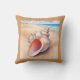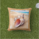 Pillow in a watercolor-design of a large conch shell resting on a sunlit beach. Soft pastel tones and gentle details give it a dreamy, relaxed feel. The ocean’s turquoise blues and fluffy clouds in the background add to the peaceful, tropical feel