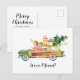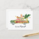 Christmas themed moving home postcards featuring a cute watercolor retro car, packed full of gifts, a dog, xmas tree, a scattering of snow, holiday greetings, and your new address.