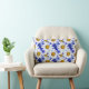 Throw pillow in a watercolor pattern of white daisies with golden yellow centres, on a background in shades of denim blue