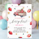 A cute baby shower invitation features a watercolor strawberries in the truck, and daisy flowers. These baby shower invitations are easily customised for your event by simply adding your details.