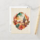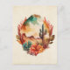 A postcard with a beautiful painted illustration. Green cacti and brown mountains with orange desert flowers. Scenic pretty southwest design.