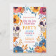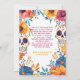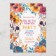 On both sides of the invitation, two beautifully decorated sugar skulls take centre stage. These sugar skulls are adorned with intricate patterns and vibrant colours, creating a festive and traditional look. Surrounding the sugar skulls are clusters of pink, yellow, and blue flowers, adding a pop of colour and creating a cheerful and celebratory atmosphere. The floral elements harmonise with the sugar skulls, giving the invitation a balanced and cohesive feel.