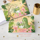 Capture and cherish every message, well-wish, and piece of advice from your loved ones with this beautiful personalised guest book. The hardcover features a charming watercolor scene with a hatching baby dino in a pink bow and a friendly adult dinosaur, set against a vibrant tropical sunset of oranges and pinks. Lush green foliage and a beautiful pink flower add to the whimsical jungle atmosphere. This guest book is fully customisable with the honoree's name and the baby shower date on the front and spine, making it a treasured keepsake to look back on for years to come. It is the perfect match for the rest of the "Girl Can Roar Too" collection.