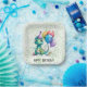 I hope you'll enjoy this green paint splatter for the background and yellow, red, blue, and purple balloons with a cute painted dinosaur. Matching invitations and birthday party supplies are available in this collection suite.