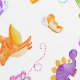 Watercolor cute assorted dinosaurs in purple, blue, yellow, and orange with flying butterflies on baby girl nursery wallpaper.