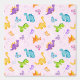 Watercolor cute assorted dinosaurs in purple, blue, yellow, and orange with flying butterflies on pink texture background for baby girl nursery.
