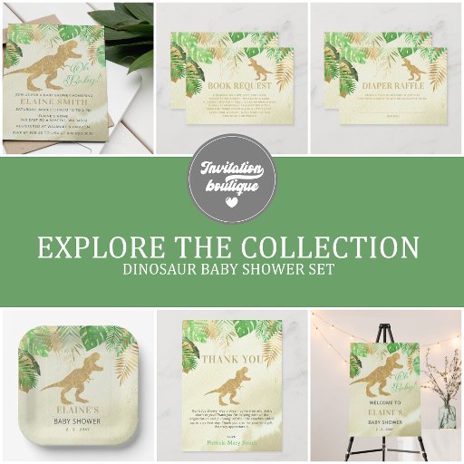 Watercolor Gold Dinosaur Jungle Gender Neutral Baby Shower Invitations