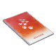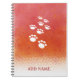 Watercolor dog paw tracks in white, red and orange with paint splatter effect applied to the image. Custom notebooks with original design. Edit name to customise. Gift idea for dog lovers.