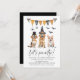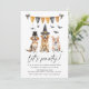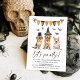 Cute Halloween party invitations featuring watercolor illustrations of a beagle, golden retriever, and corgi dressed in festive Halloween costumes. A black and orange bunting hangs at the top with two dangling spiders and flying bats for a spooky touch. “Let’s Pawty!” is displayed in playful modern calligraphy, with your event details below. Perfect for kids’ Halloween costume parties or dog-friendly celebrations.