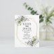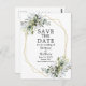 Modern Elegant Watercolor Botanical Greenery Save The Date Postcard includes eucalyptus leaves, green botanical foliage, dusty blue leaves and other beautiful botanical greenery. Gold Geometric Frame.