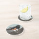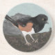Coaster with my original mixed media image of an Eastern Towhee scratching on the ground among fallen fir needles and twigs. The watercolor bird is mostly black with a white breast and rust-coloured sides. Behind it is a large stone against a pale green grassy background.
