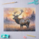 This serene watercolor painting captures a majestic elk standing gracefully at sunrise, bathed in warm golden hues. The soft brushstrokes and misty atmosphere create a peaceful, nature-inspired scene perfect for wildlife and landscape art lovers.