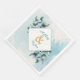 Personalised wedding paper napkins with a watercolor Eucalyptus greenery botanical theme. Pretty pale sage green, blue, gold and white.