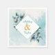 Personalised wedding paper napkins with a watercolor Eucalyptus greenery botanical theme. Pretty pale sage green, blue, gold and white.