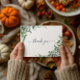 The digital art background features eucalyptus greenery corners.