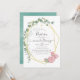 Trendy geometric eucalyptus greenery and blush pink roses baptism invitation with gold geometric frame and mint watercolor wash reverse.