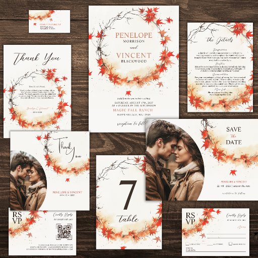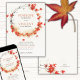 This special wedding invitation draws inspiration from the romantic , magical colours of autumn, showcasing a round wreath frame made of autumn leaves. It is a classic, close to nature choice that adds an elegant touch to any wedding.