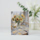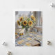 Sunlight streams through two windows, casting playful shadows across a wooden table adorned with a bouquet of sunflowers in a glass jar. The table also holds a bowl of fruit, a glass jar, and a chequered cloth.