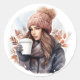 Watercolor fashion winter girl with coffee classic round sticker