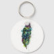 a colourful tattoo design of an abstract peacock feather in many different watercolors on a button keychain