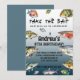 Celebrate your little boy's special day with our fishing birthday invite! Designed to make your party planning a breeze, with adorable and eye-catching designs that will make your little fisherman happy and impress your guests. Design features a variety of colourful, detailed fish in different sizes and species, placed around the edges of the image. The fish are drawn in a semi-realistic, almost hand-painted style, with vibrant colours like red, green, yellow, and blue. They appear lively and in motion, adding energy to the design. The fish include species such as bass, trout, and other freshwater fish.🎣🐠🎂🎈