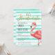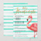 Give your shower a tropical theme with this beautiful watercolor pink flamingo with mint stripe background Let's Flamingle shower invite.