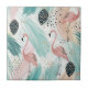 A seamless tropical pattern ceramic tile featuring elegant pink flamingos with speckled feathers and long, graceful necks. Set against broad brushstrokes in soft teal, mint, blush, and beige, the design mimics abstract palm fronds and foliage. Accented with dark stylised leaves flecked with gold and scattered black dots, this artistic watercolor-style pattern captures a dreamy, modern tropical vibe. Ideal for summer, beach themes, or tropical-inspired aesthetics.